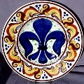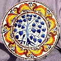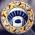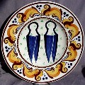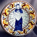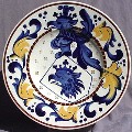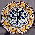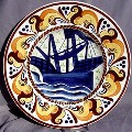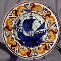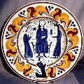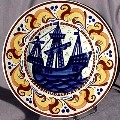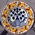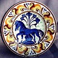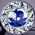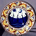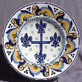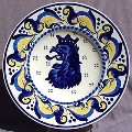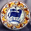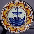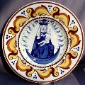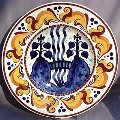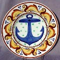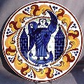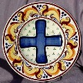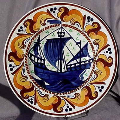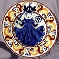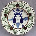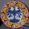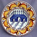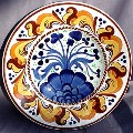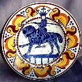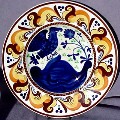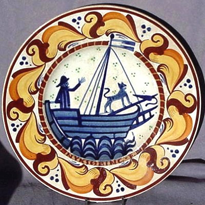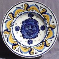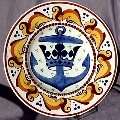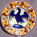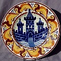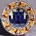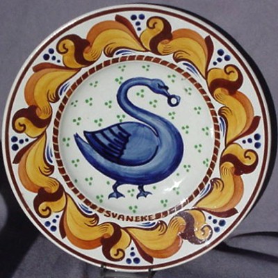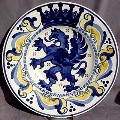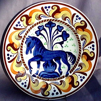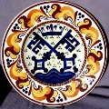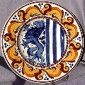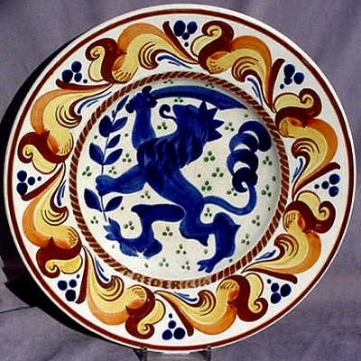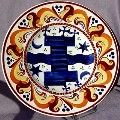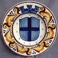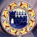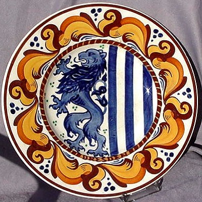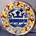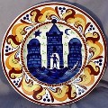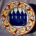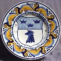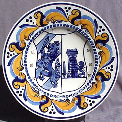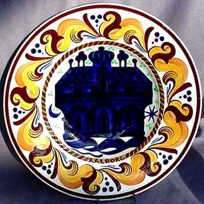 Royal Copenhagen designated its faience (earthenware) products as Aluminia, and used a separate trademark for them -- a large "A" with the crossbar of the "A" replaced with the three wavey lines of Royal Copenhagen. In 1904 and 1905, a series of 9 inch plates were made featuring the Town Coats of Arms for a variety of cities and towns in Denmark. Two German cities (Dresden and Munich) were aded in 1909, and several Swedish cities and counties (#1049 to #1082) were added in 1915. All were hand-painted in brilliant colors.