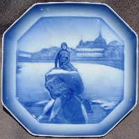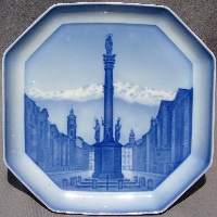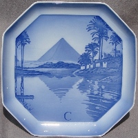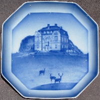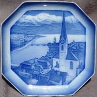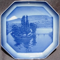 Produced by B&G in 1933 and 1934, designed by Ove Larsen, approximately 7.7 inches square (19 cm), hand-painted on porcelain with the design molded in relief (like the Christmas plates). The first series, issued in August 1933, shows cities of the world, with the first letter of the city at the bottom of the scene. There are at least 24 such plates, one for each letter of the alphabet (missing Q and X). A second series was issued in April 1934, featuring famous landmarks in and around Copenhagen, all WITHOUT a letter at the bottom. I know of 5 in this series, all pictured below; there were probably 8 or 12.
