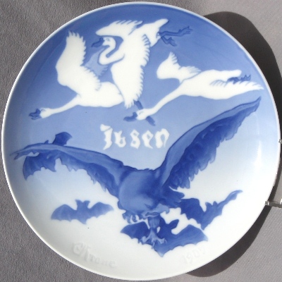 Plate issued in 1907 to commemorate the death of the Henrik Ibsen in 1906. Ibsen was largely responsible for the rise of modern realistic drama, and is often referred to as the "father of modern drama." Ibsen is held to be the greatest of Norwegian authors and one of the most important playwrights of all time.