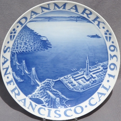 Aerial View of San Francisco Bay looking west, with the Bay Bridge in the foreground, connecting to Treasure Island (lower right), sight of the 1939 San Francisco World's Fair. The city of San Francisco is upper left, with the Golden Gate Bridge in the distance, and Alcatraz Island in the middle of the bay. The inscription DANMARK (Denmark) flanked with shields bearing the Danish Flag, topped with the Danish Crown. Issued to raise money for the Danish Pavilion at the Fair.