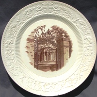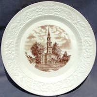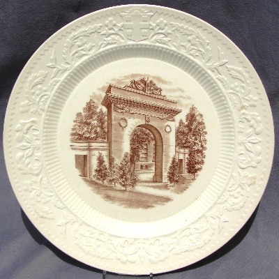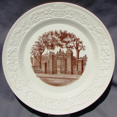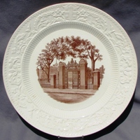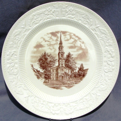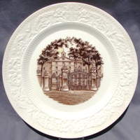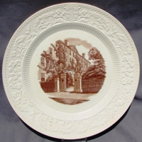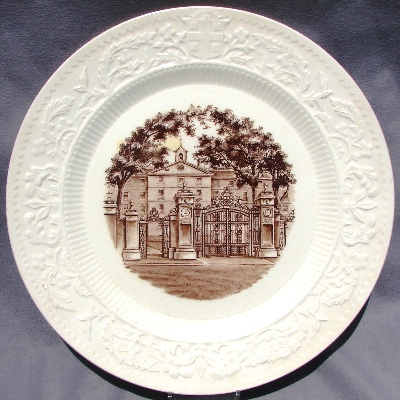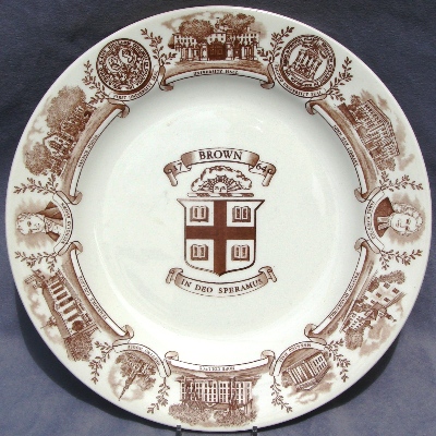 Wedgwood issued a set of College Plates for the Brown University in 1938: 6 different views, transfer printed in brown on a 10.25 inch diameter Queensware (earthenware) plate. The border was created for this series, and features the Brown University crest molded in relief at the top of each plate. These plates proved so popular with alumni/ae that they were reissued several times, and two new views were introduced in the 1960s (not shown here).
