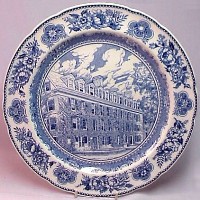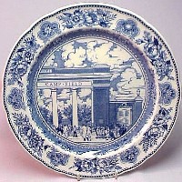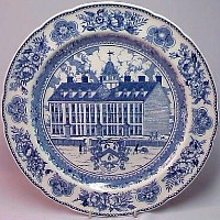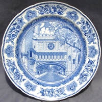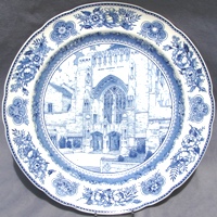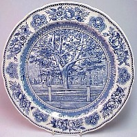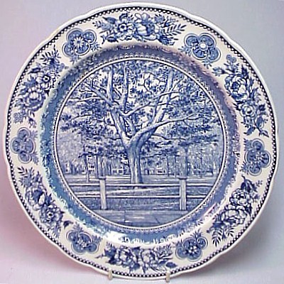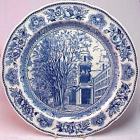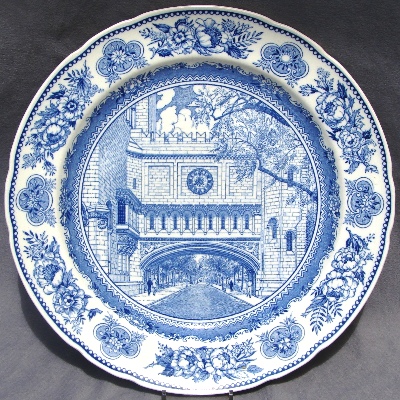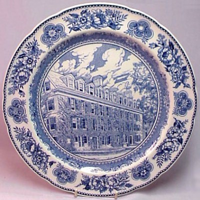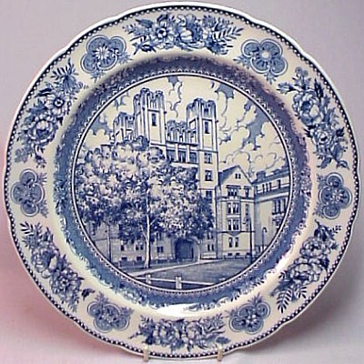 Wedgwood issued a set of College Plates for the Yale University in 1931: twelve different views, transfer printed in blue on a 10.5 inch diameter Queensware (earthenware) plate, with a floral border and slightly scalloped edge. These plates proved so popular with alumni/ae that they were reissued several times, and matching salagdplates, bread plates, cups and saucers, platters, teapot, creamer and sugar bowl were also made. One of the most extensive services of College China ever made by Wedgwood.