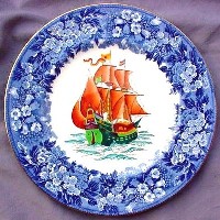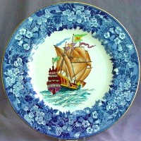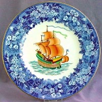 Shown below are all six Galleons in a very rare treatment: Bone china, 10.5 inch diameter plates, Ferrara (bluebell) border, gold rim. These are the only six such plates that I have ever seen (and I have bought and sold over 100 of various Fantasy Galleon plates, and looked at many more). Price at $150 each, or $675 for the set of six (save 25% if you buy the set). These would be fabulous on the wall of any office, nautical themed room, or home near the water.