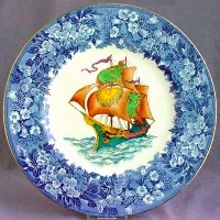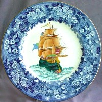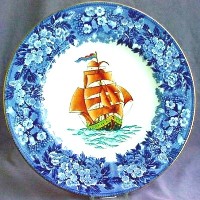 Wedgwood produced a series of 6 engravings of FANTASY GALLEONS -- stylized drawings of Galleon style ships in full sail being tossed by the waves. These engravings were then used to produce plates, using the "print and tint" method: the outlines were transferred (printed) onto the plate (usually in black, sometimes in blue), and then they were handpainted (tinted) in full color. This was done on a number of different types of plates, with a number of different borders. Most were done on Queensware (earthenware) plates; a few on bone china. Some of the Queensware plates had reticulated (pierced) or shaped edges (not perfectly round).