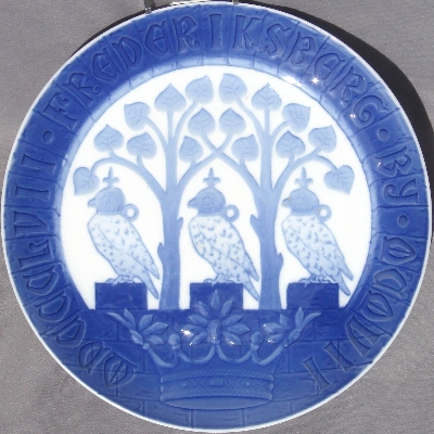 Issued to mark the 50th anniversary of the City of Frederiksberg, just outside Copenhagen. This plate was also made with hand-colored highlights fired under the glaze. The three falcons on a castle wall are taken from the Frederiksberg City Arms. From about 1890 through 2005, the Royal Copenhagen factory was located in Frederiksberg.