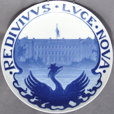 The Phoenix arising from the flames makes reference to a fire that devasted the Academy in 1750. On the back of the plate is an inscription saying that it was issued in a limited edition of 550 copies, making it the only B&G commemorative plate where the edition size is known.