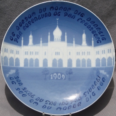 Tivoli Gardens opened in 1843 on 15 acres in what is now downtown Copenhagen. It is the second oldest amusement park to survive essentially intact through the present day. The building featured on this plate was one of many that were burned by the Nazis in 1943 in an attempt to break the spirit of the Danish people. This plate was also made with the building hand-painted in tan under the glaze.