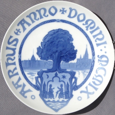 The Coat of Arms of the City of Aarhus, with a view of the city in tha background. Issued for the Danish National Exhibition in Aarhus in 1909. See Royal Copenhagen plate #89.