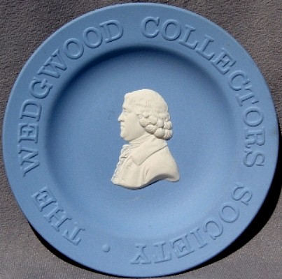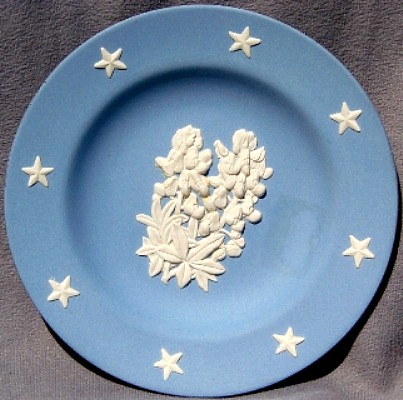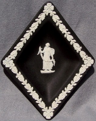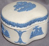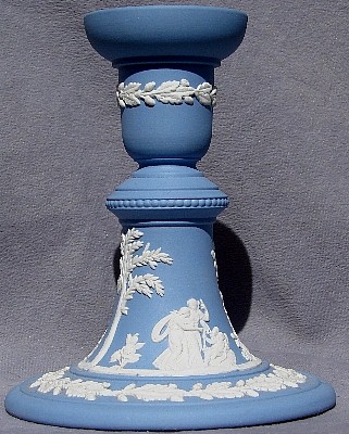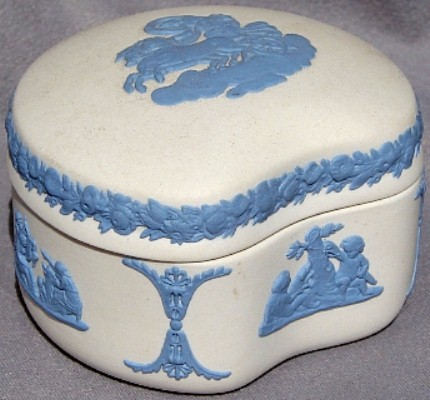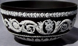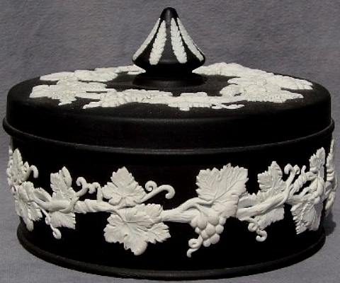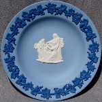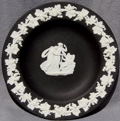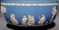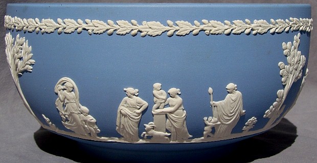 Wedgwood is perhaps MOST famous for its Jasperware. "Jasperware" refers to the "body" or type of clay used to make the item; other "clay bodies" include basalts, bone china, and earthenware (or "Queensware"). The original intent was to make ceramic articles that looked like cameos cut from layered stone, where the image in relief is one color, set against a background of a different color. This type of cameo relief is achieved by tediously carving away the top layer of stone to expose the lower layer of stone (of a different color), leaving just the desired design in relief. Wedgwood sought to achieve a similar effect by molding the relief design in one color of clay, and applying the design to the surface of an object made from a different color clay. The most common color combination is a white relief design applied to a medium blue ("Wedgwood Blue") object.