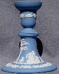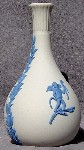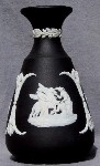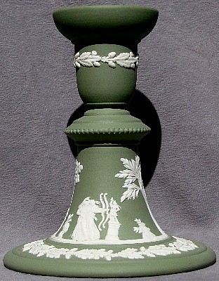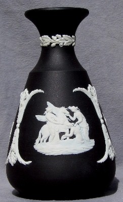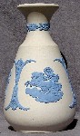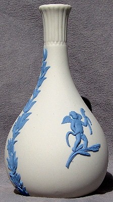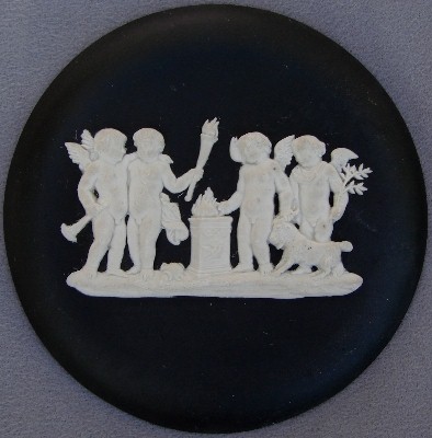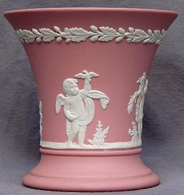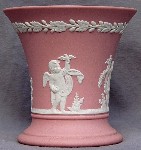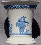 Most of the relief designs imitate classical Greek and Roman styles and themes, reflecting the popular enthusiasm for such designs at the time that Josiah Wedgwood developed his jasperware clays and techniques (late 18th century). In addition to colors, most items can be identified as having one of a limited number of shapes (you will see the same shapes in different colors below), and can further be identified by the subect matter of the relief decoloration. The "reverse color" item above is a "Posy Pot" (shape) with decorations representing the "Four Seasons", with Spring (cherub with bird & bird's nest) most prominent, and Winter (cherub huddled over fire) just visible on the left. Summer (cherub with flower garland) is to the right, and Fall (creub with harvest sickle) is on the back, so all Fours Seasons progress continuously aroud the vase.